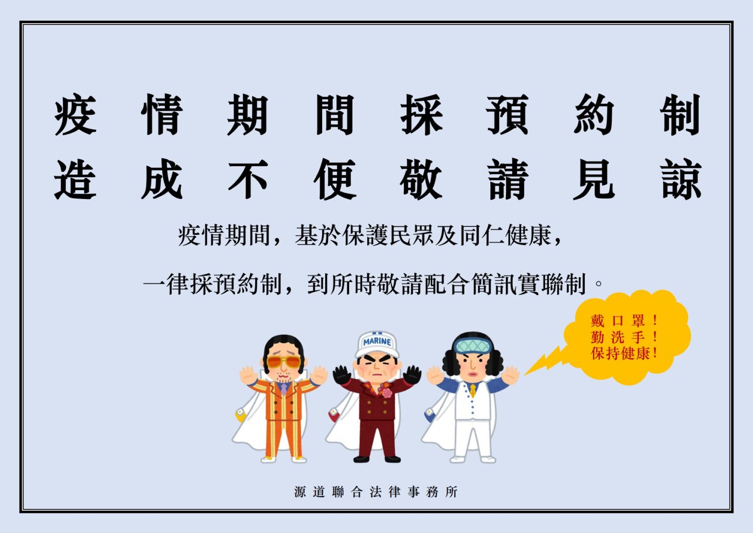 疫情期間,本所全面採預約制, 到所時敬請配合門口公告,全面配戴口罩、配合簡訊時聯制, 有任何問題,歡迎多加利用電話、LINE、E-mail等管道
