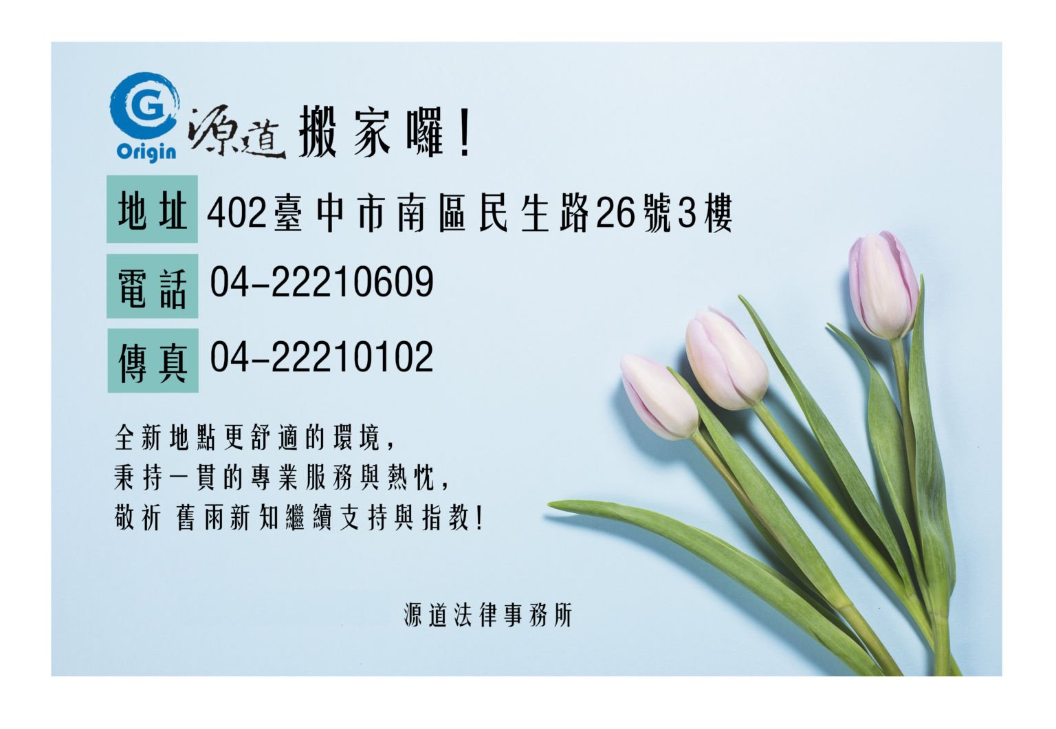 我們搬家囉! 源道法律事務所即日起在「臺中市南區民生路26號3樓」為您服務。 全新的地點、更舒適的環境, 不變的是我們專業的服務與熱忱! 敬祈